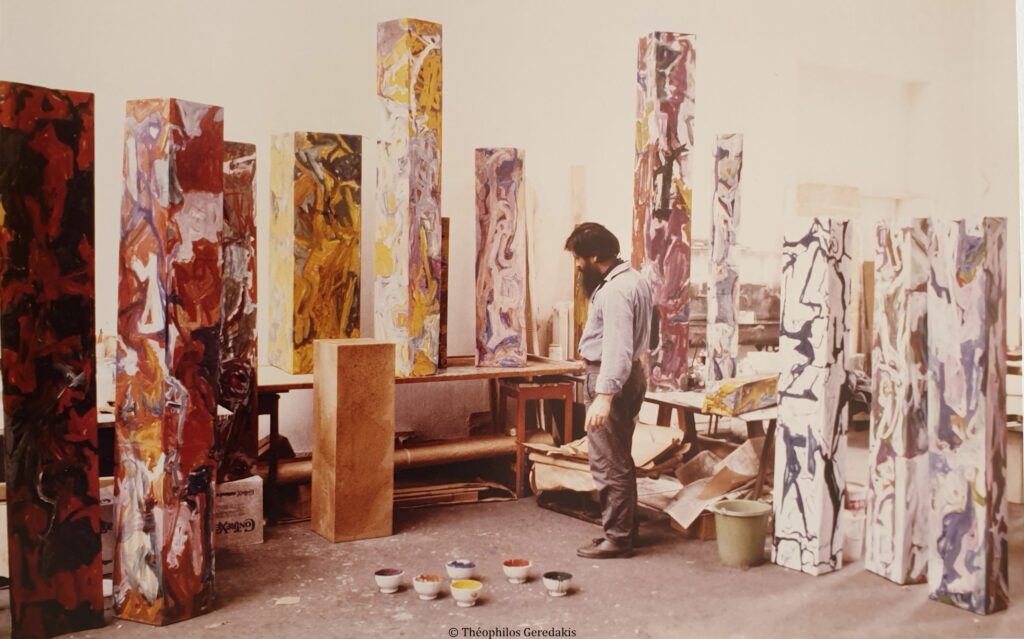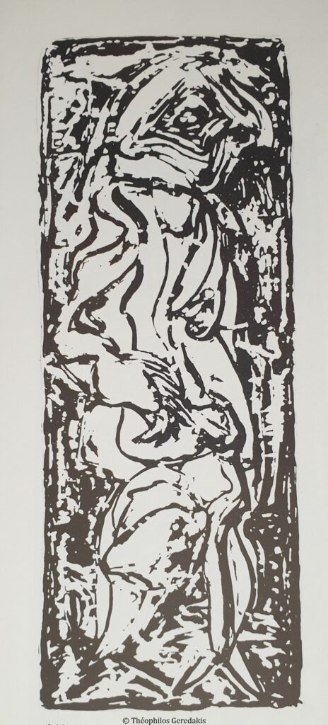 Depuis son enfance, Théophilos ne cesse d’être habité par la nécessité de créer dans un élan toujours renouvelé et à travers des expériences multiples que ce soit au sein de son village en Crète, sur un cargo à travers l’océan ou encore à Paris à l’école des Beaux-Arts. Il est animé par un besoin vital d’expression, en-dehors de toute convention académique, très proche du mouvement Cobra auquel a appartenu son maître, Pierre Alechinsky, avec qui il a travaillé à Paris et à Bougival.