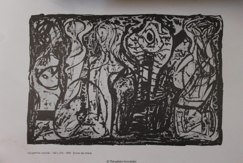 Dans « Le peintre caché » (encre de chine, 1992) se dressent cinq formes massives occupant magistralement l’espace dans une appréhension verticale et, caché au milieu de l’œuvre,